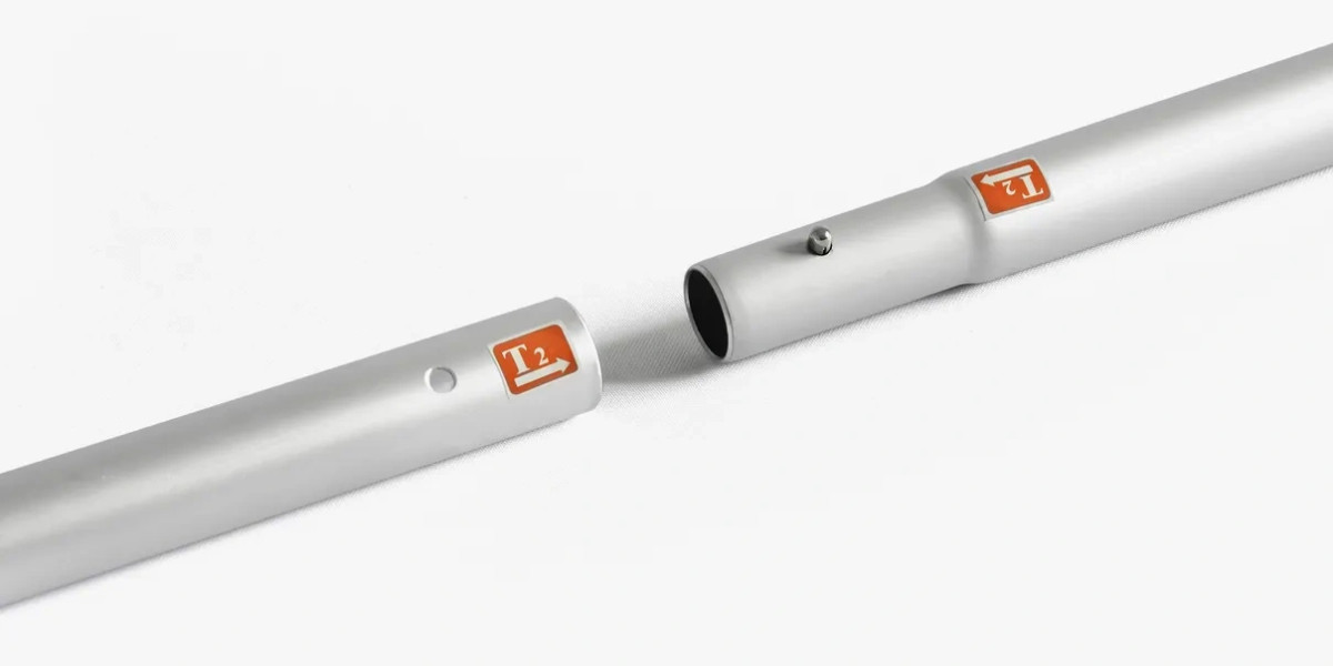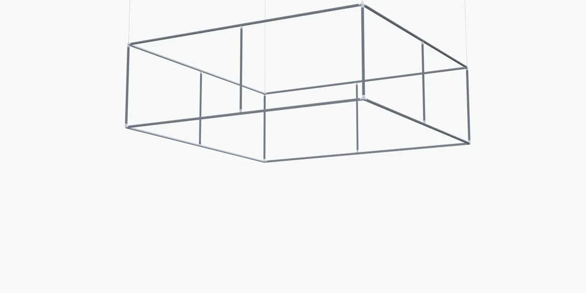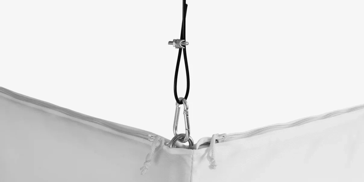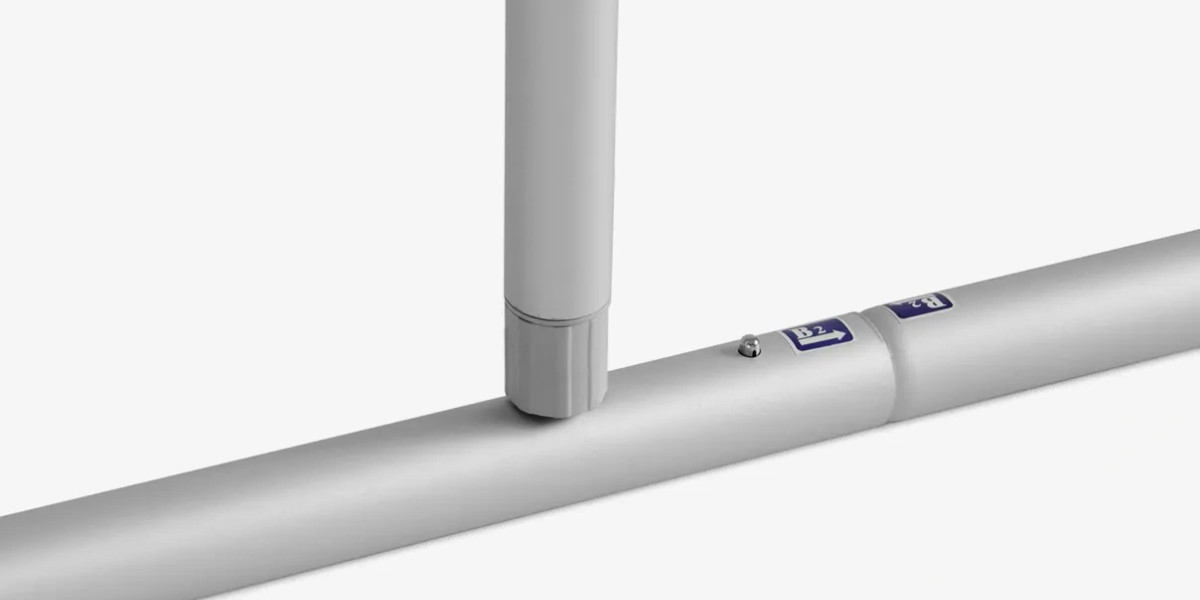Det hængende display Quadfloat består af en let rørkonstruktion og dobbeltsidet trykt tekstilstof. Det trykte stof fastgøres til rammen med lynlås.