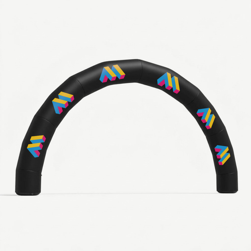 The design is printed on weather-resistant polyester material that covers the inner tube. Once inflated, the promotional arch maintains air pressure without needing to be constantly connected to a compressor. The arch can be reused multiple times, and the outer cover can be replaced if needed.