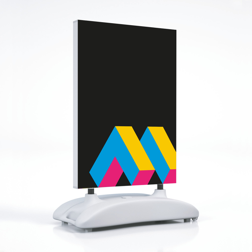 LED A-skylt Àr dubbelsidig och hÄlls stadigt pÄ plats med en vattenfylld bas.